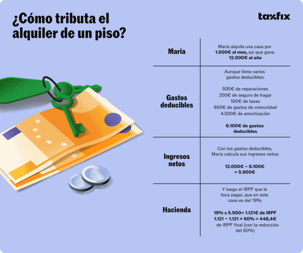 Voyez ci-dessous un exemple réalisé par TaxFix, quand la déduction fiscale était de 60% (désormais elle est de 50%). Dans leur exemple, le taux d’IRPF est de 19%, remplacez le par votre taux d’IRPF.