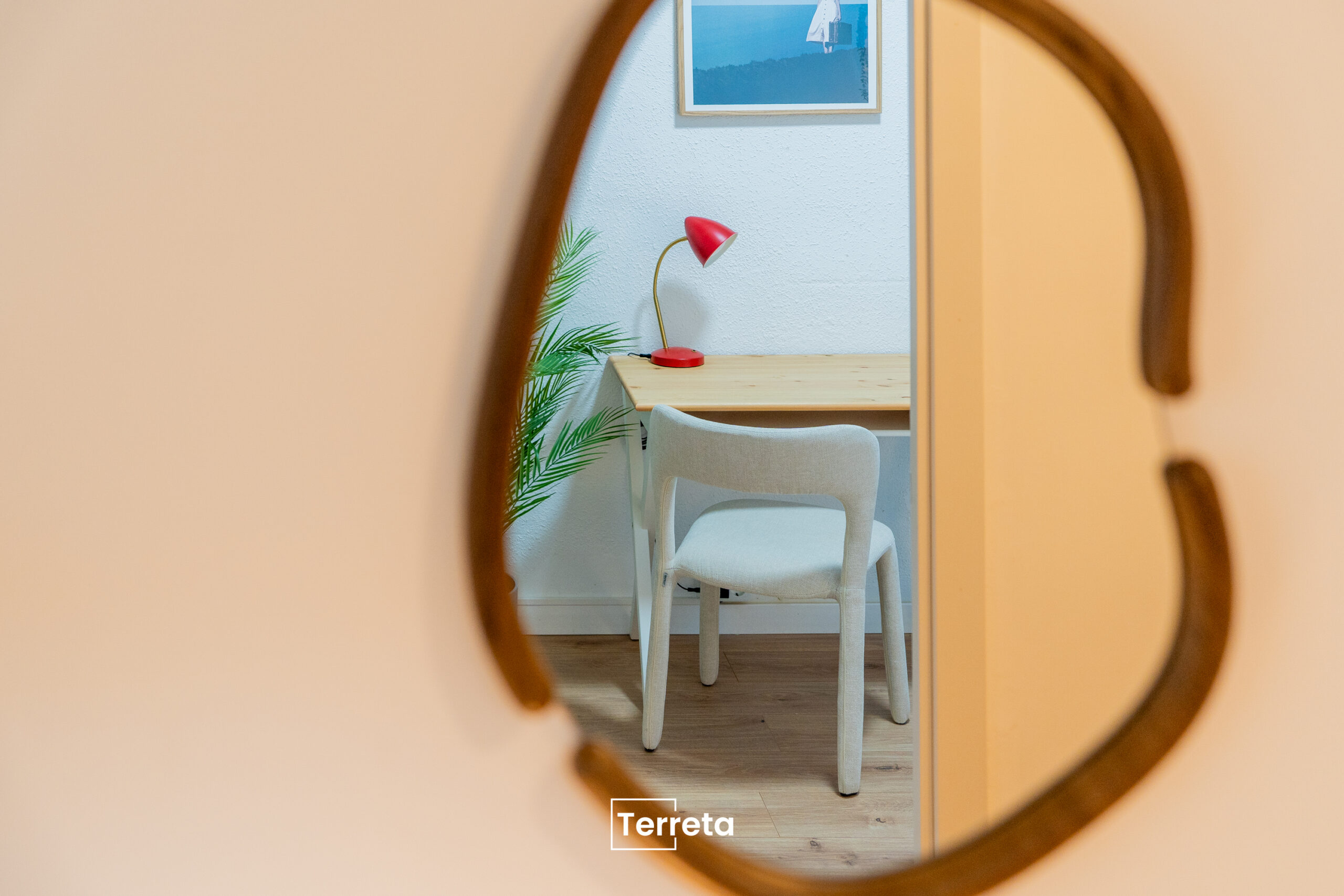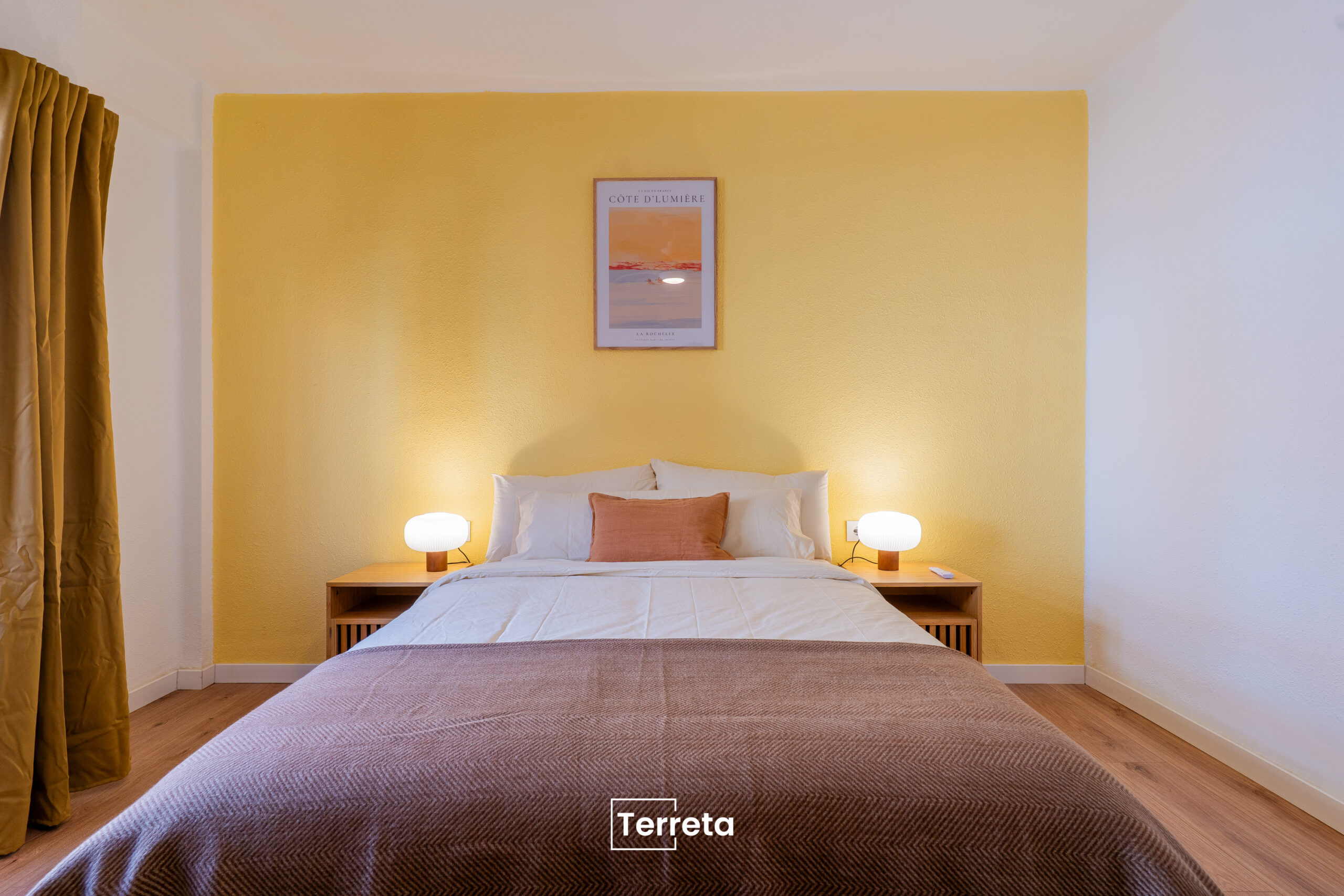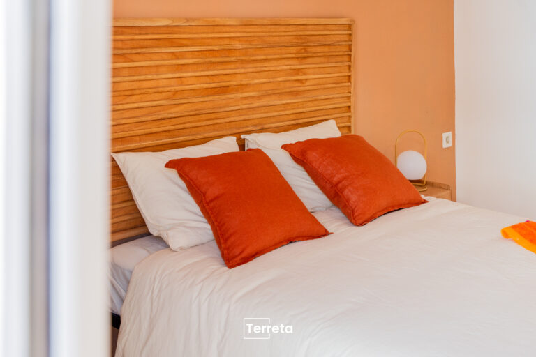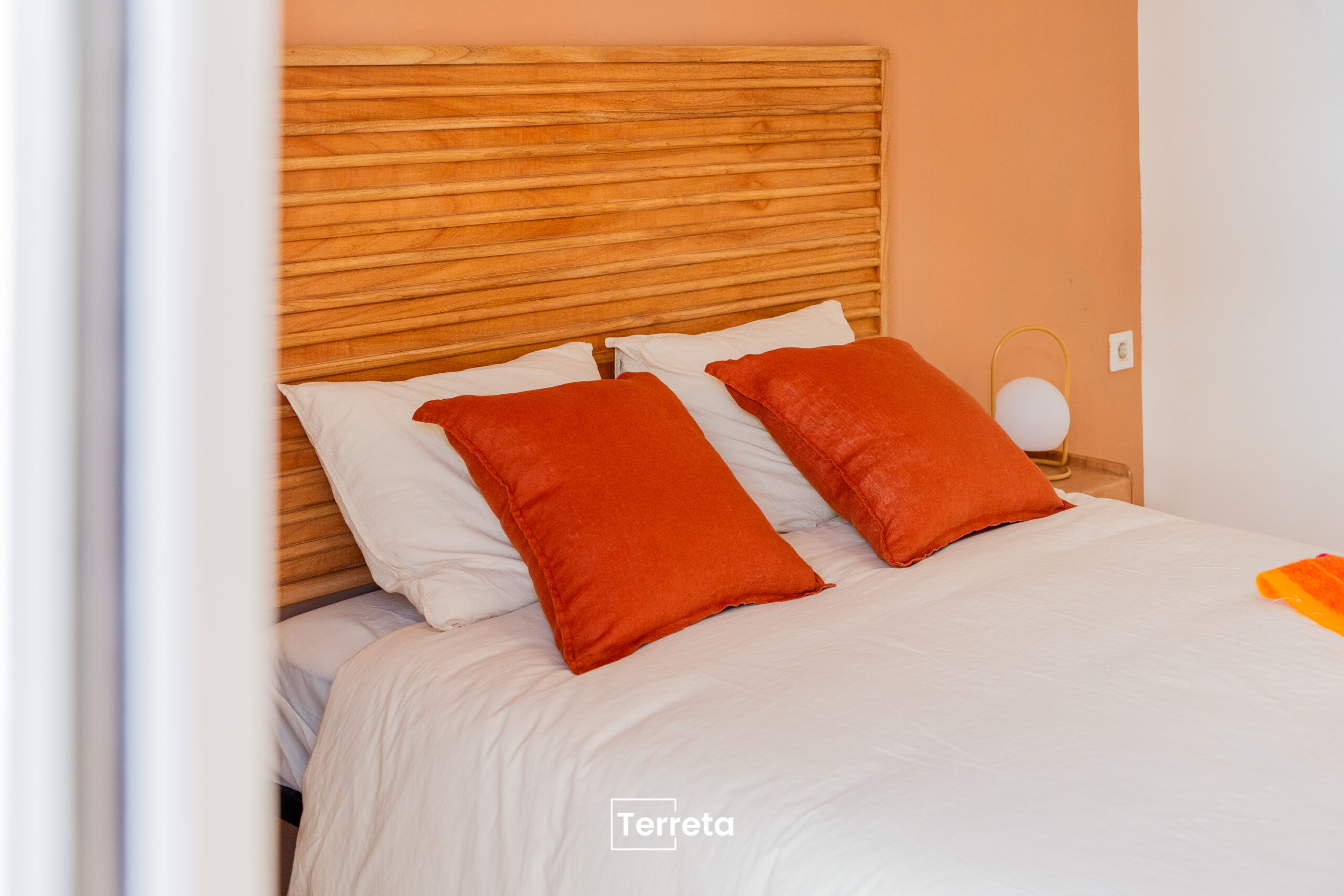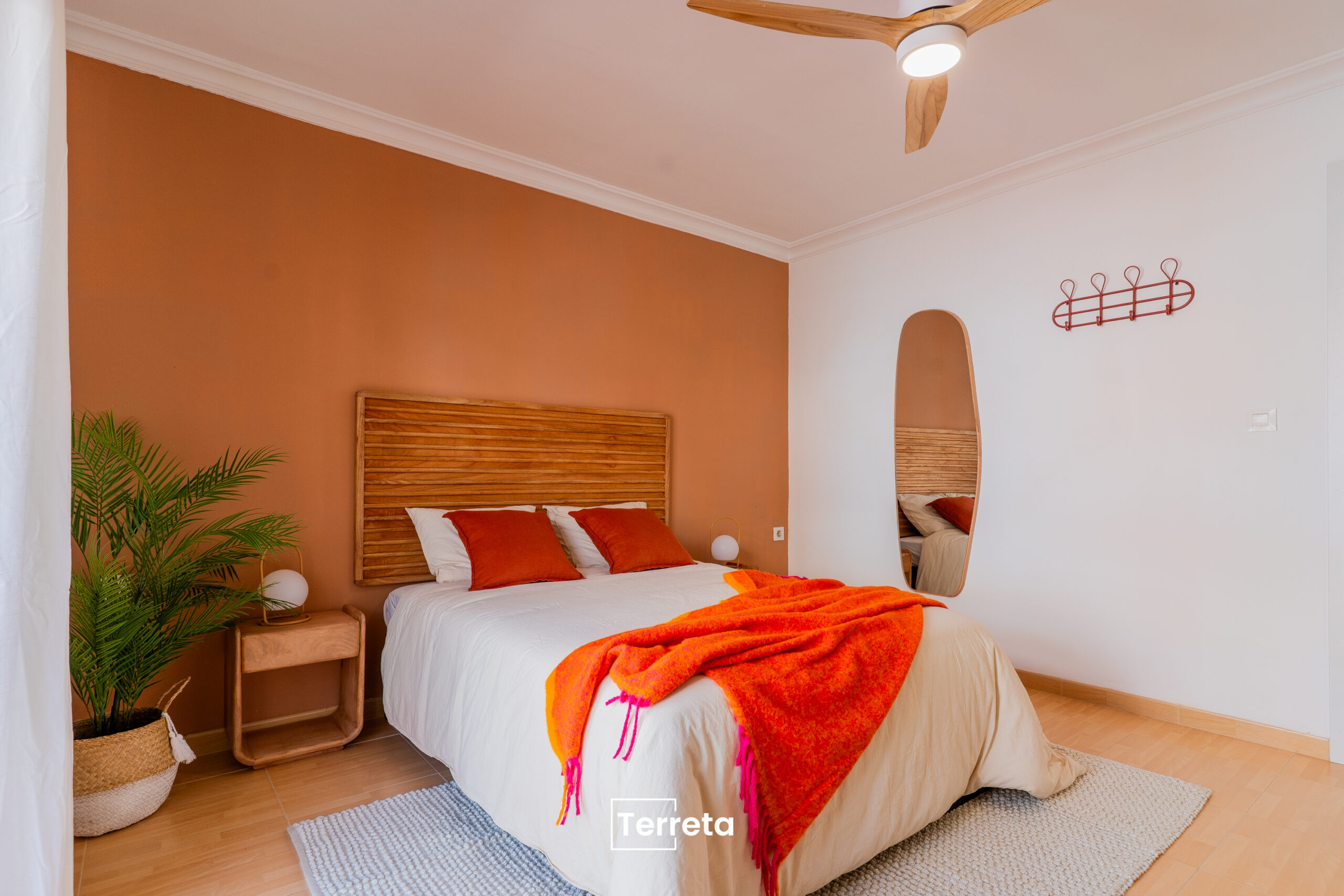 Chambre en colocation rénovée avec bureau et tête de lit rouge et orange à Valence