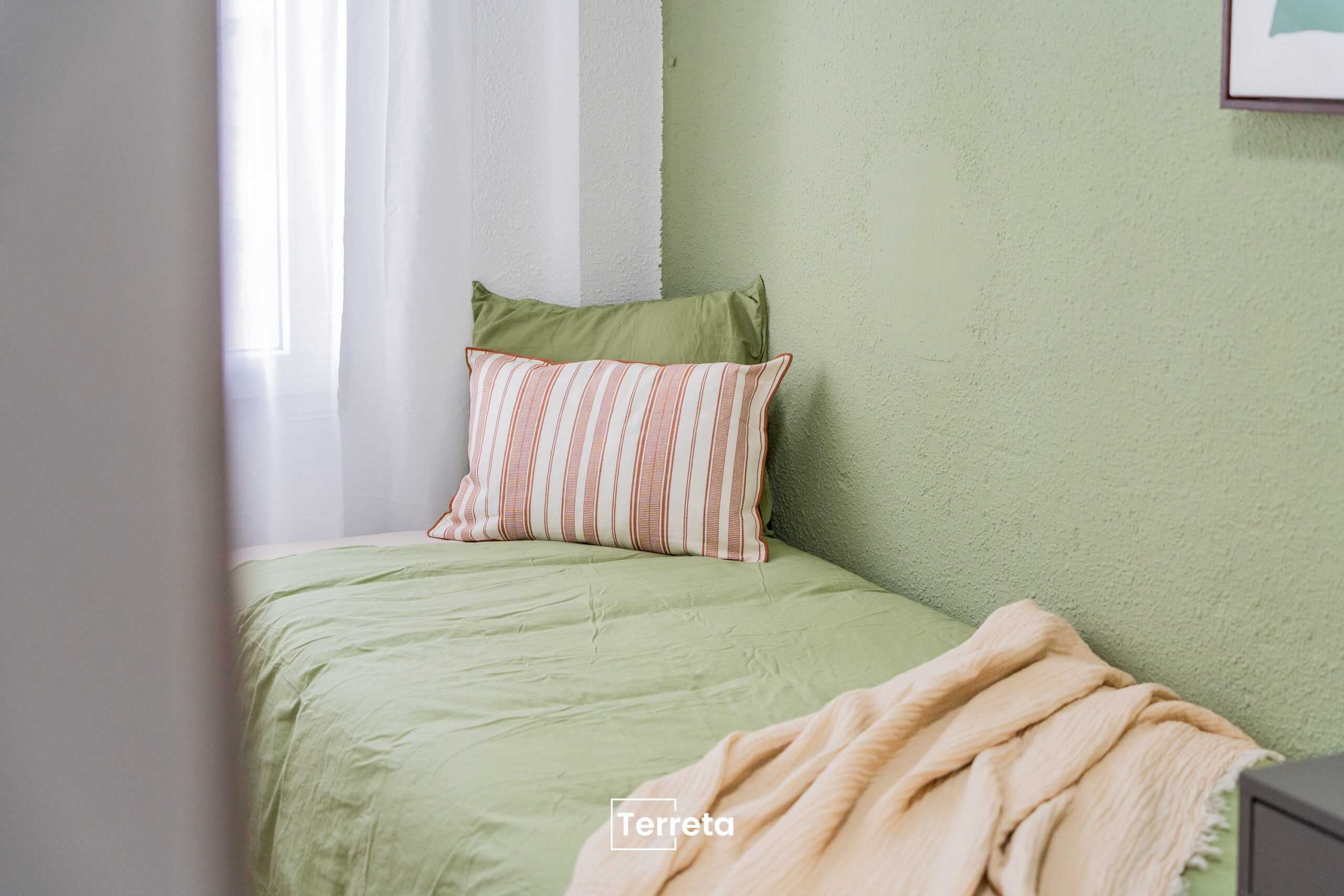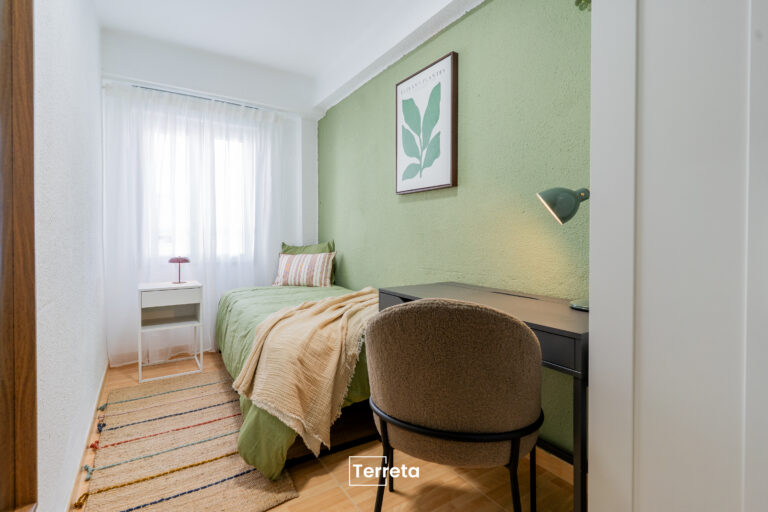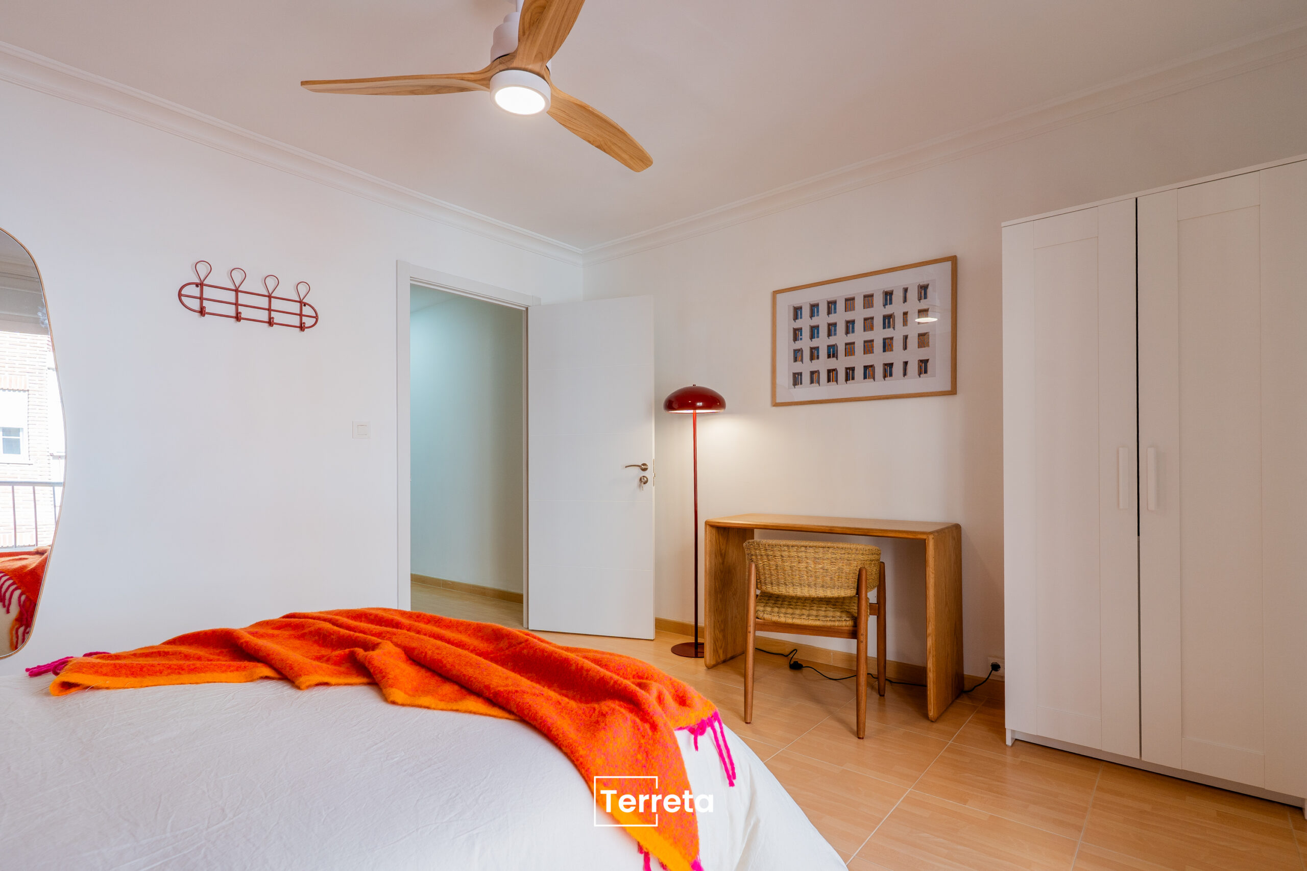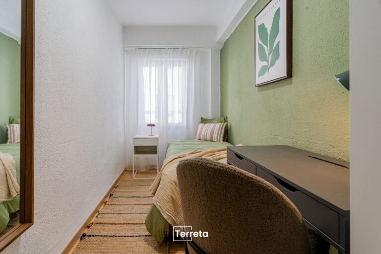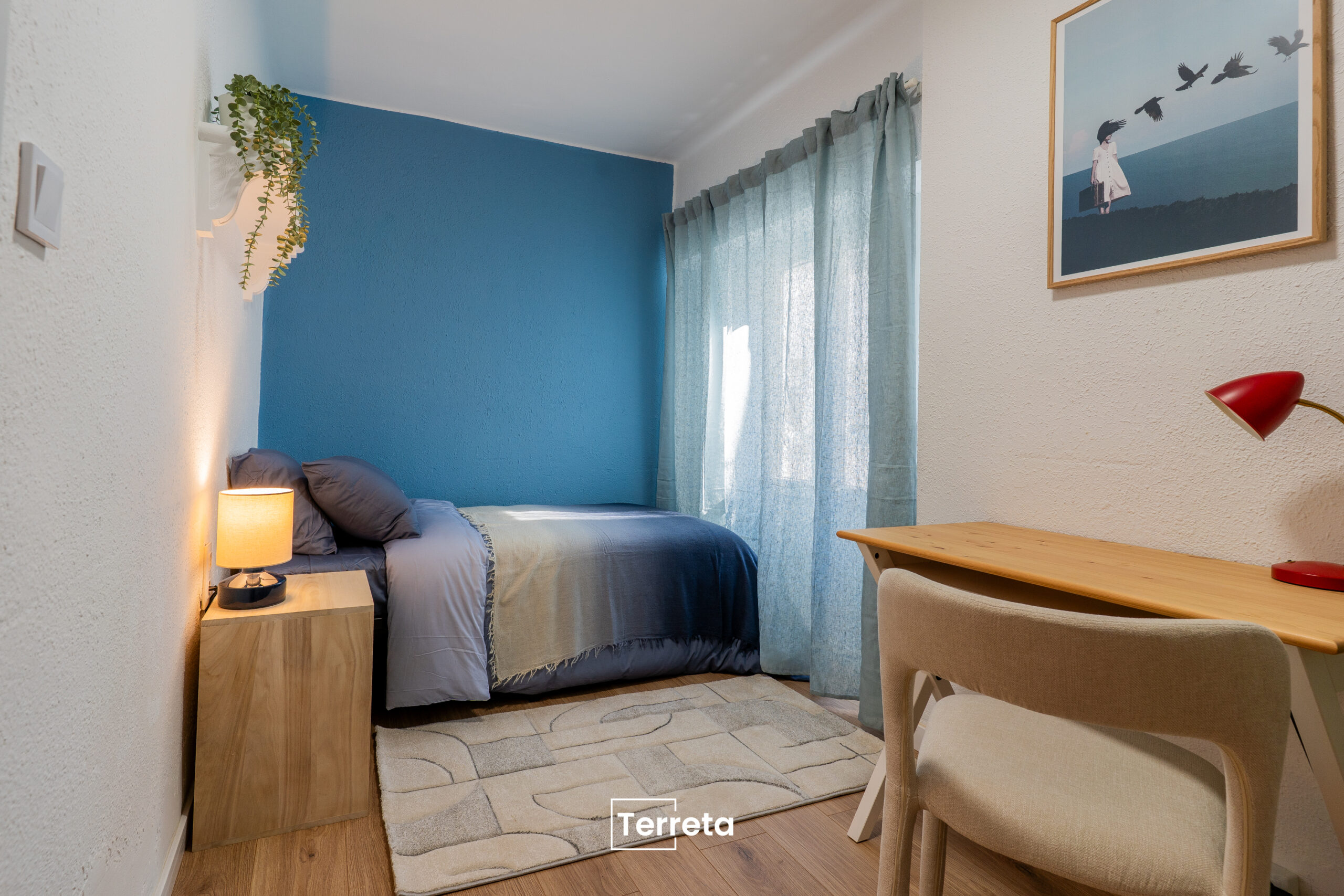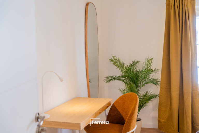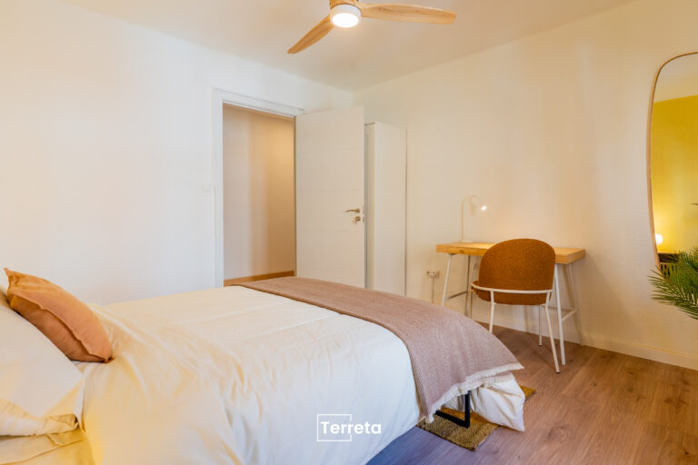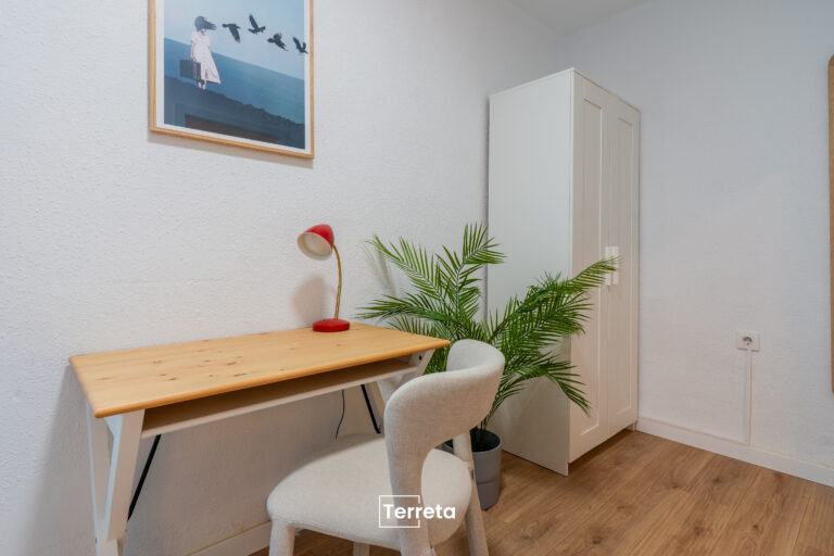 Chambre en colocation rénovée avec bureau et tête de lit rouge et orange à Valence