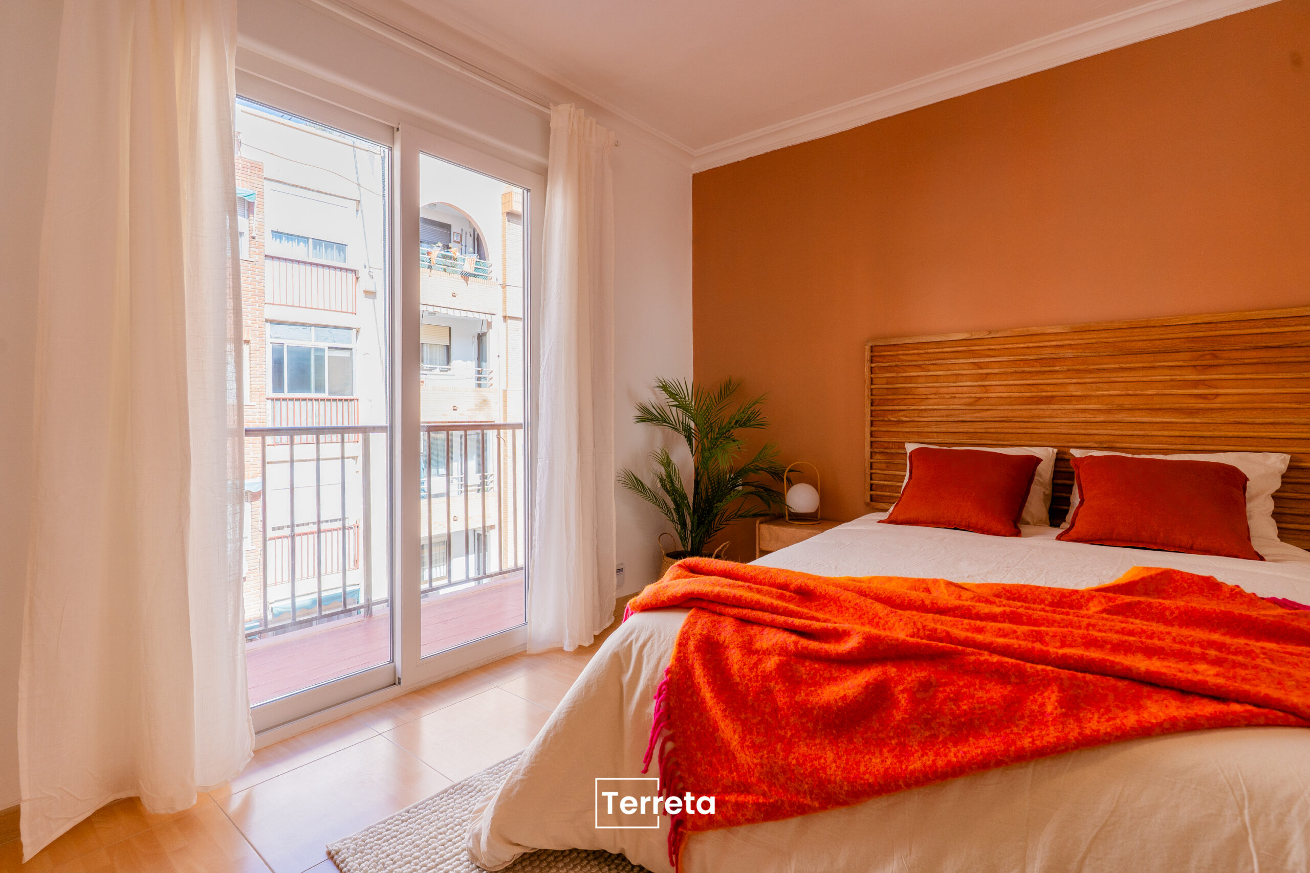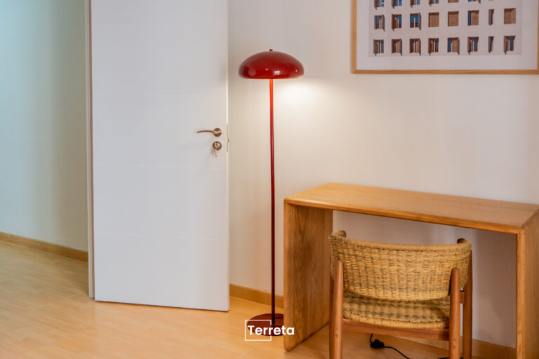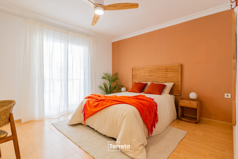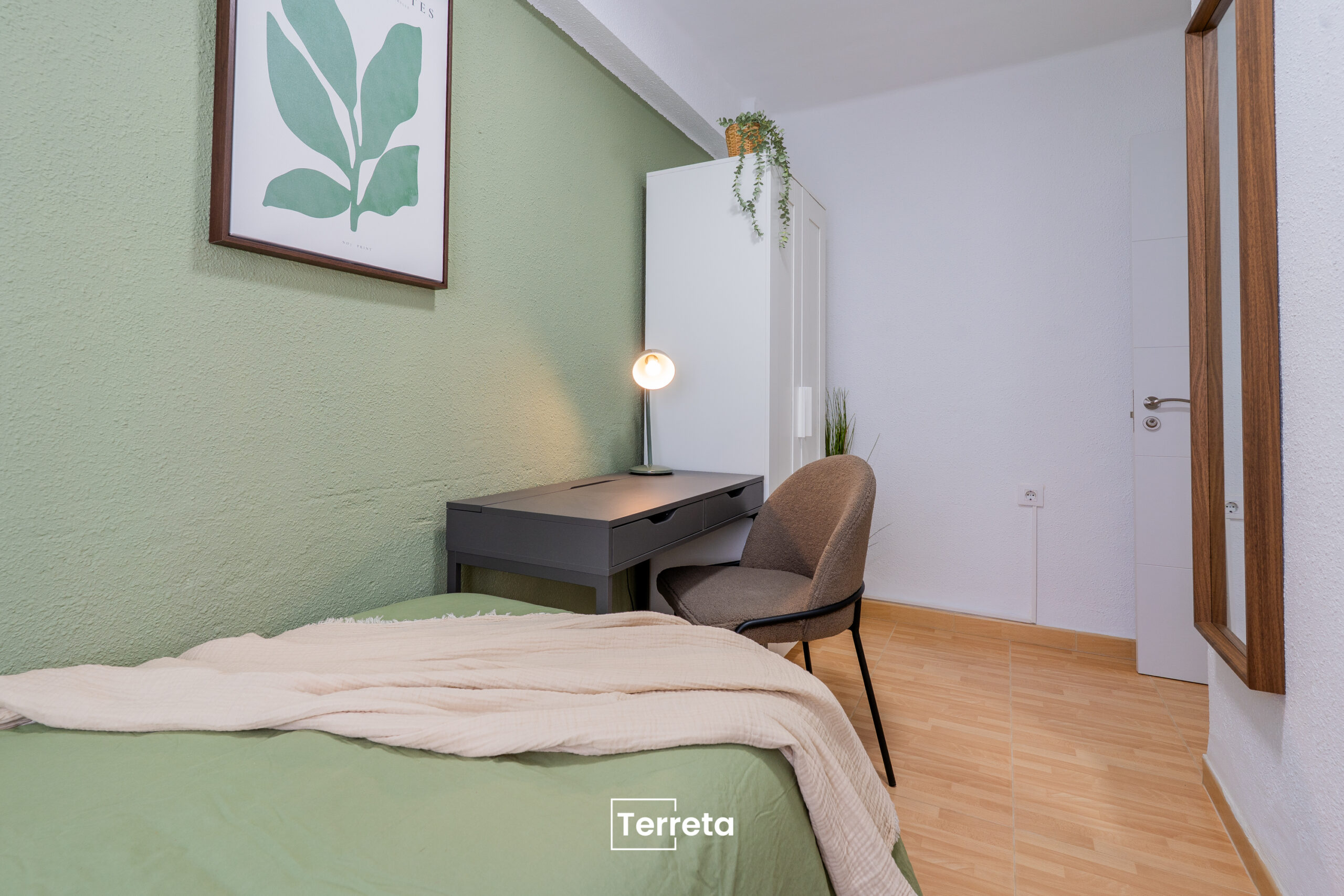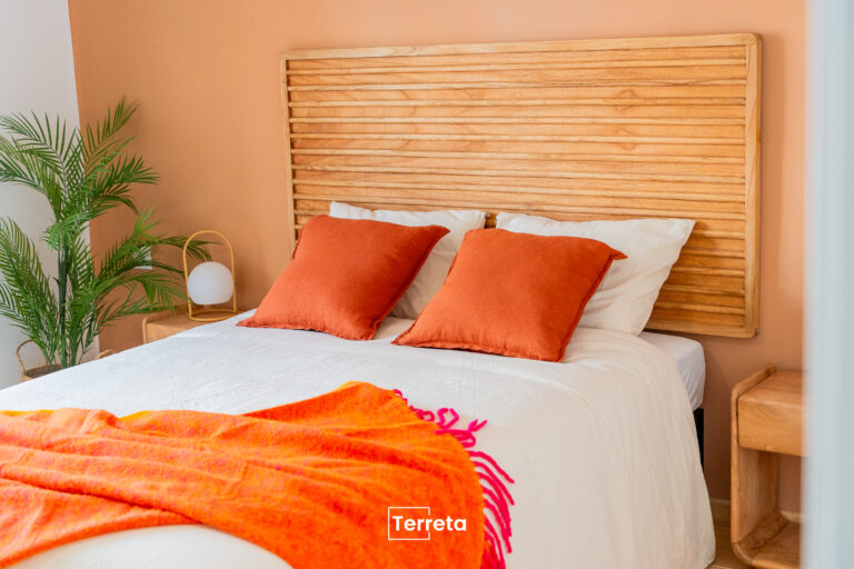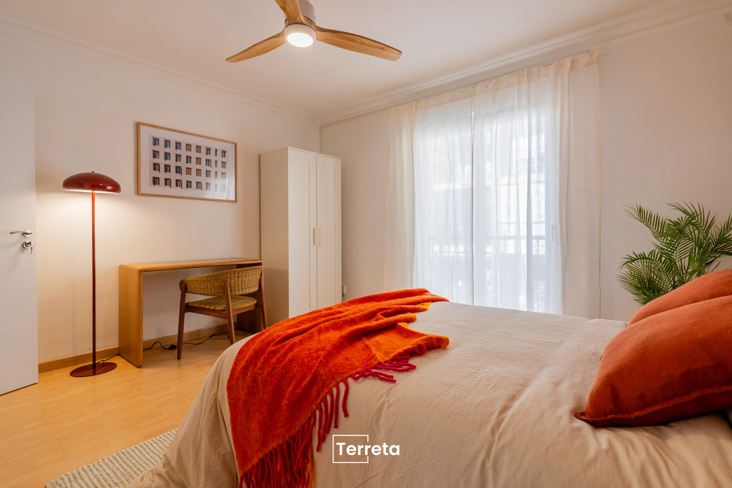 Chambre en colocation rénovée avec bureau et tête de lit rouge et orange à Valence
